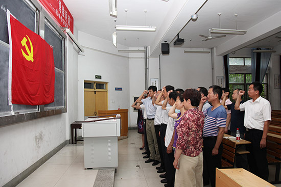 7 月1日 下午,后勤服务处党支部在奎文校区9号楼102教室开展重温入党誓词宣誓活动。